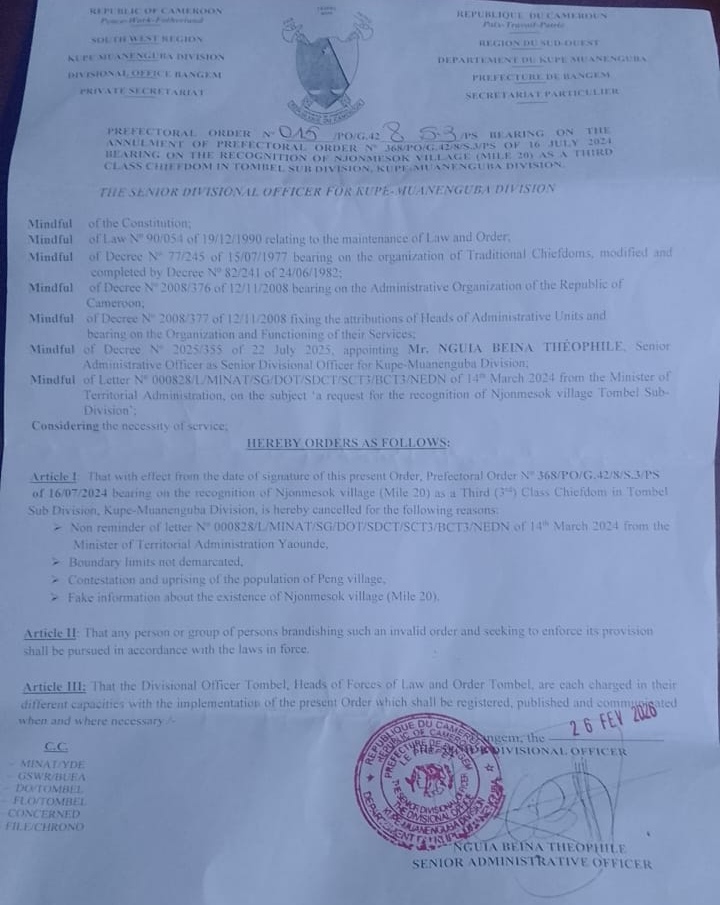 The Senior Divisional Officer of Kupe Muanenguba, Nguia Beina Theophile has cancelled Prefectoral Order No 368/PO/G.42/8/S.3/PS of 16th July 2024, bearing on the recognition of Njonmesok village (Mile 20) as a third (3rd) Class Chiefdom in Tombel Sub Division, Kupe Muanenguba Division, South West Region.