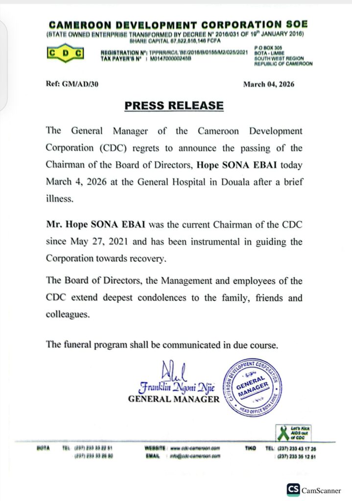 In a press release from the General Manager of CDC, Franklin Ngoni Njie, he said the Board Chairman died at the General Hospital in Douala after a brief illness. He said as Chairman of the Board of Directors of CDC since May 27, 2021, Hope Sona Ebai has been instrumental in guiding the Corporation towards recovery.